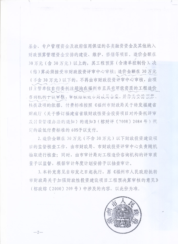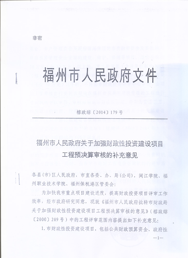 福州市人民政府關(guān)于加強(qiáng)財(cái)政性投資建設(shè)項(xiàng)目工程預(yù)決算審核的補(bǔ)充意見(jiàn)