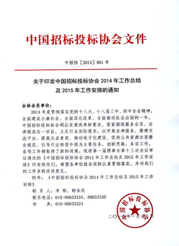2015 年是全面完成“十二五”規(guī)劃的收官之年,是全面建成小康社會(huì)、全面深化改革、全面推進(jìn)依法治國(guó)的關(guān)鍵之年。在國(guó)家發(fā)展改革委和有關(guān)部門的關(guān)心指導(dǎo)下,在廣大會(huì)員和行業(yè)同仁的大力支持下,協(xié)會(huì)將團(tuán)結(jié)和引領(lǐng)全體會(huì)員積極適應(yīng)經(jīng)濟(jì)新常態(tài),努力把握行業(yè)發(fā)展新趨勢(shì),解放思想,求真務(wù)實(shí),共同努力為開創(chuàng)招投標(biāo)行業(yè)新局面做出新的貢獻(xiàn)。